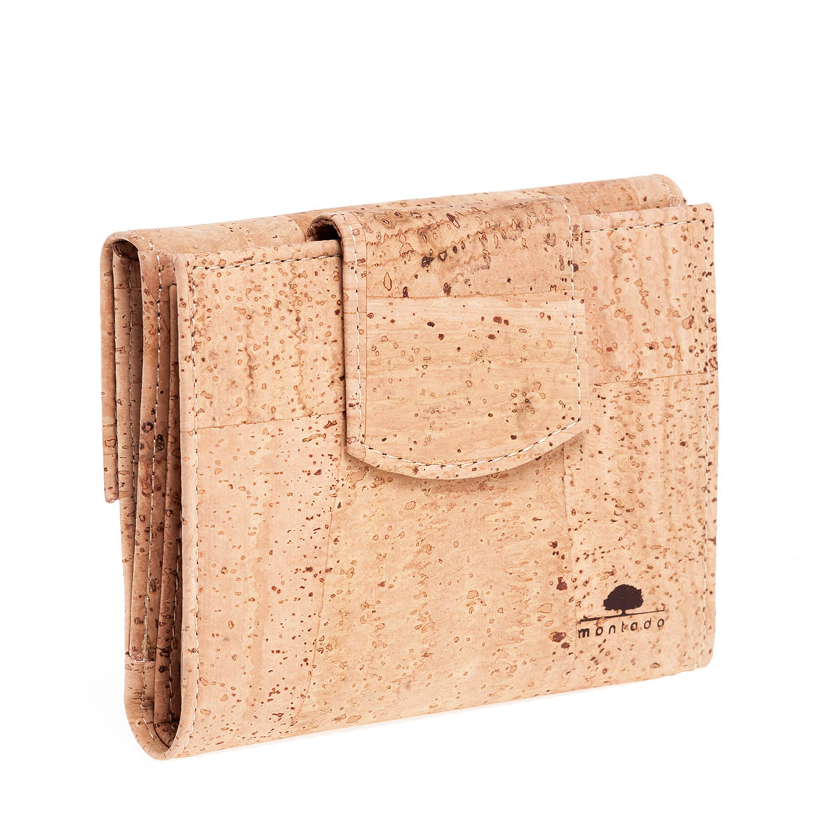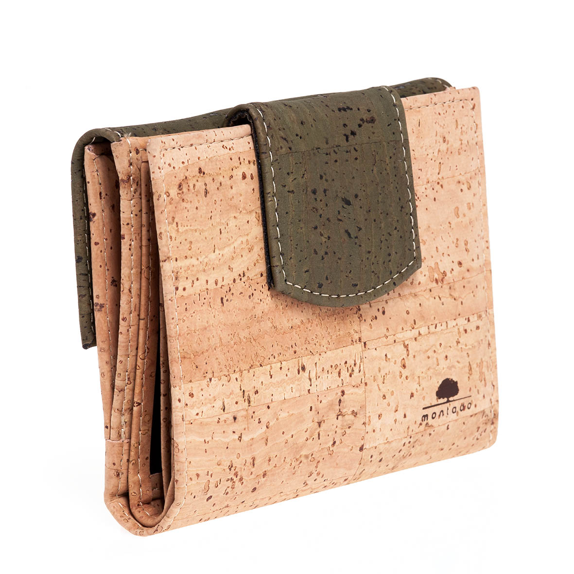 Carteira Vegan de cortiça com duas divisões, uma para moedas e outra para notas e documentos. No interior possui um bolso com fecho, espaço para 8 cartões, micas e espaço para notas. Na confeção desta carteira não foi usado nenhum material de origem animal.